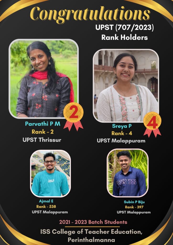 🎉 Heartfelt Congratulations! 🎓 ISS College of Teacher Education proudly congratulates our distinguished UPST Rank Holders, the shining alumni who have once again brought glory to our institution. 🌟 Your remarkable achievement is a reflection of your dedication, hard work, and the strong foundation of excellence you built during your time at ISS CTE. You