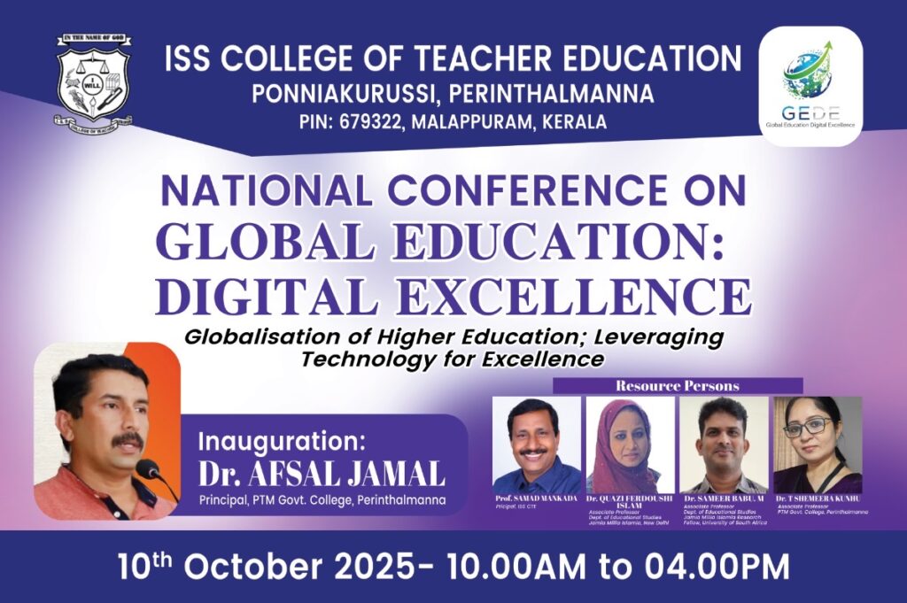 Report on the National Conference on Global Education: Digital Excellence The ISS College of Teacher Education, Ponniakurussi, Perinthalmanna, organized a National Conference on “Global Education: Digital Excellence” on 10th October 2025 from 10.00 AM to 4.00 PM. The conference aimed to explore the theme “Globalisation of Higher Education; Leveraging Technology for Excellence.” The inaugural session