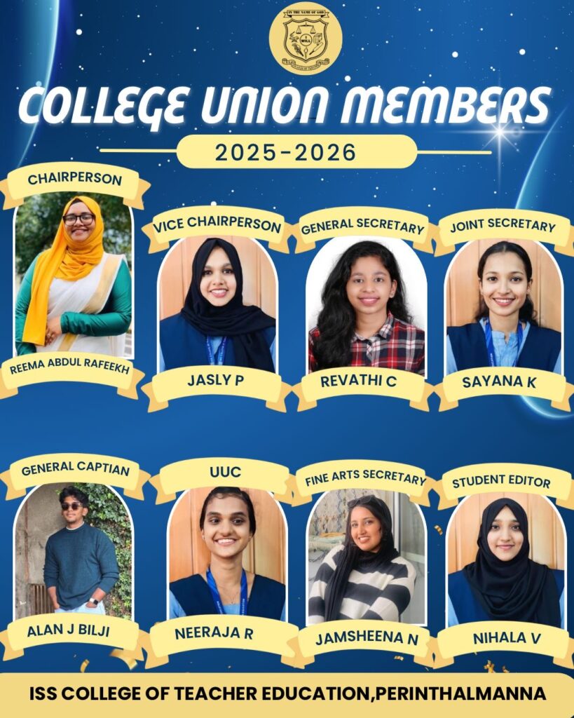 College Election 2025–26 The College Election for the academic year 2025–26 was successfully conducted at ISS College of Teacher Education, Ponniakurussi, Perinthalmanna. The election provided students an opportunity to exercise their democratic rights and elect their representatives in a free and fair manner. The process was carried out smoothly under the supervision of the college